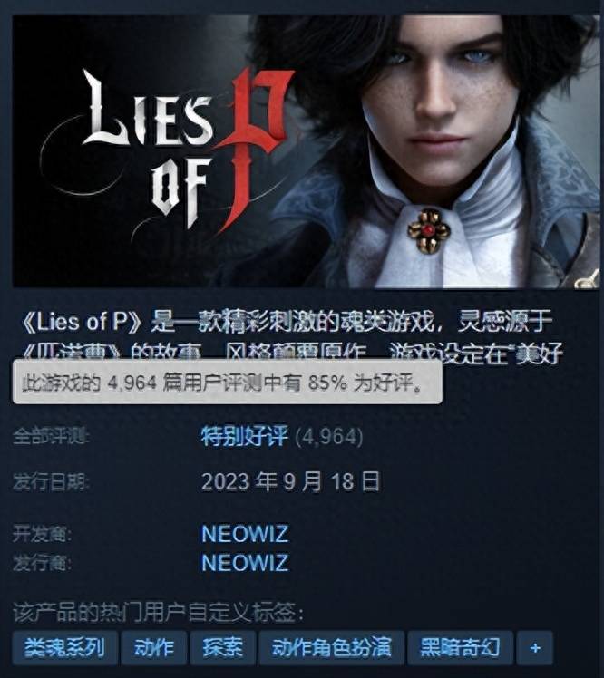 《匹诺曹的谎言(Lies of P)》是韩国公司Neowiz Games开发的类魂系动作游戏,这款游戏曾在科隆游戏展中获得了“最佳动作游戏奖”、“最佳RPG游戏奖”、“PS顶级期待作”三冠王,在韩国的地位不亚于《黑神话:悟空》在中国玩家心中的分量。