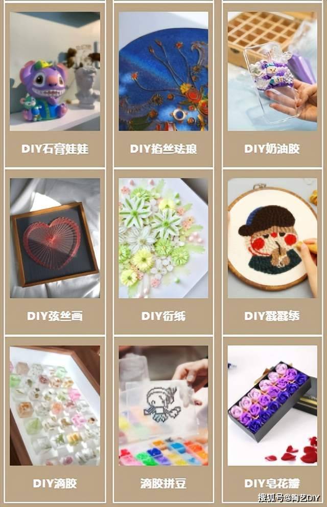 陶艺、木艺、手工皂、蜡烛、花艺、黏土、软陶、奶油胶、流体熊、石膏娃娃、滴胶、拼豆、衍纸、浮游花、捕梦网、弦丝画、戳戳绣、掐丝珐琅……