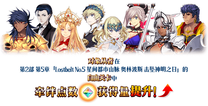 在本次活动的期间内,下表中的从者在第2部 第5章「Lostbelt No.5 星间都市山脉 奥林波斯 击坠神明之日」的自由关卡中,将获得「牵绊点数获得量提升」的加成效果!