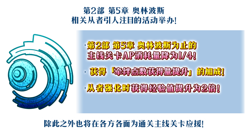 以下时间段内,主线关卡第2部 第5章 奥林波斯为止的AP消耗量限时降为1/4!(即使在战斗中撤退,AP消耗量也会降为1/4)
