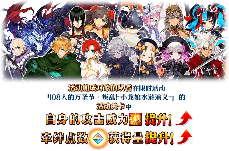 限时活动「108人的万圣节·叛乱!~小龙娘水浒演义~」期间内,部分从者将在活动关卡中被付与「自身的攻击威力提升」和「羁绊点数获得量提升」的效果!