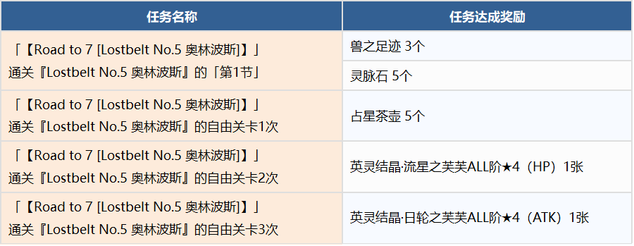※根据主线关卡的进度,有可能出现「【Road to 7 [Lostbelt No.5 奥林波斯]】任务」无法完成的情况。