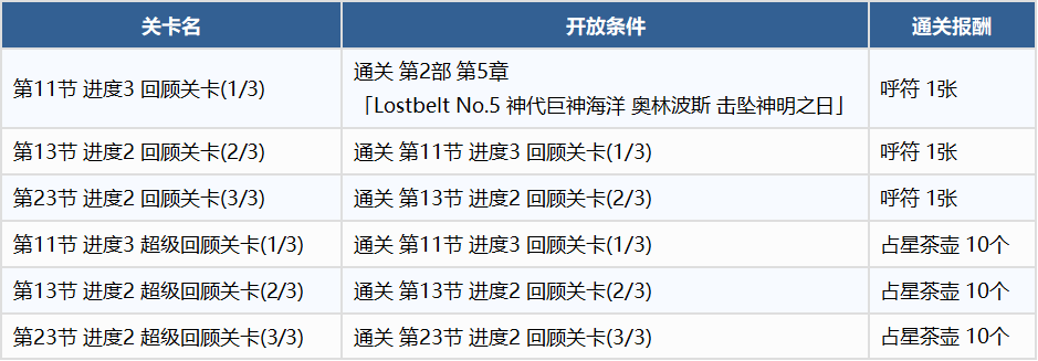 「回顾关卡」和「超级回顾关卡」在通关后不会消失,御主们可以尝试不同的从者与概念礼装组合,进行多次挑战。