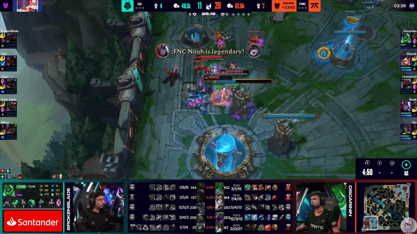 自从G2用换线4人路恶心了BDS一把之后,这个套路似乎在LEC开始流行起来了。今天G2对战Fnatic第一局,G2再次换线让小炮上去吃镀层,而Fnatic将计就计,直接上野一起走下变成4人路。小炮拆塔速度确实更快,但是Fnatic在下路也是连续击杀了多次想要在塔下吃兵的塞恩。