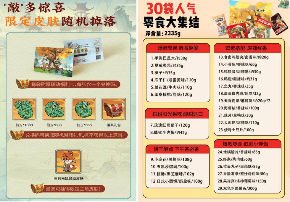 当美味来敲门,诸位道友该如何抵挡?除了参与【松鼠寻宝记】活动能获得一众豪礼外,《寻道大千》x「三只松鼠」定制联名巨型零食大礼包也已陆续上架【三只松鼠】微信小程序商城、天猫超市、天猫旗舰店、拼多多、唯品会、1688、京东旗舰店等平台。
