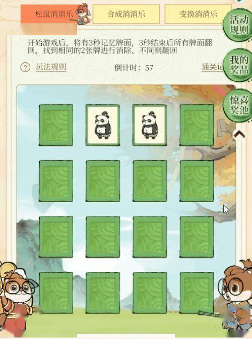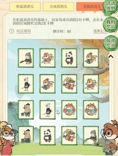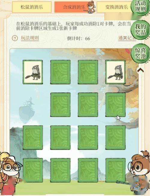 在松鼠消消乐的规则基础上,道友每成功消除2对卡牌,未消除卡牌区域将会随机调换2张卡牌的位置。