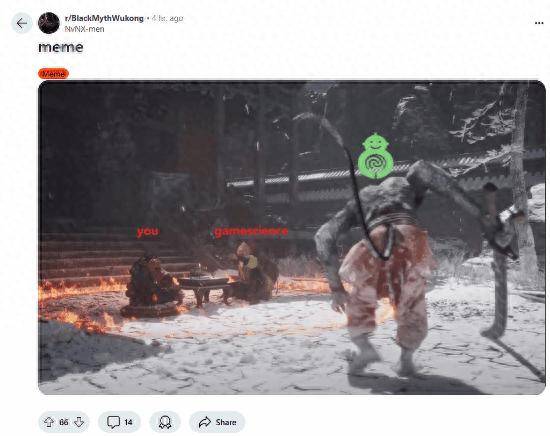 今日,游戏科学公布了《黑神话:悟空》最终预告。视频发布没多久,Reddit上就有外网网友以视频结尾“两人盘膝对饮,妖魔被挡在圈外。”的画面制作了梗图,来讽刺曾传闻妄图勒索游科700万美元的Sweet Baby。