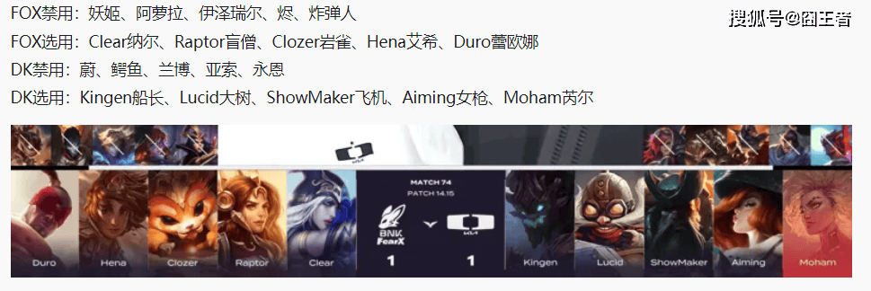 结果第一局比赛,双方各打了半程好局,不过最后FOX笑到了最后。比赛前20分钟,DK略占优势,但不大。比赛第23分钟左右,Hena泽丽爆砍四杀,FOX中路团战大胜打出2换4一举逆转经济差距;比赛第25分钟左右,两队在中路爆发团战,Clear凯南砍下双杀帮助FOX打出1换3;最终比赛第29分13秒,FOX带大龙Buff推下,Clear凯南三杀一波帮助队伍打出0换5结束比赛。