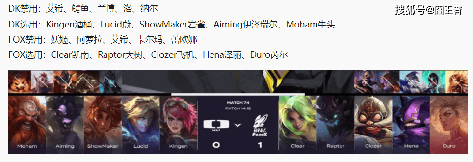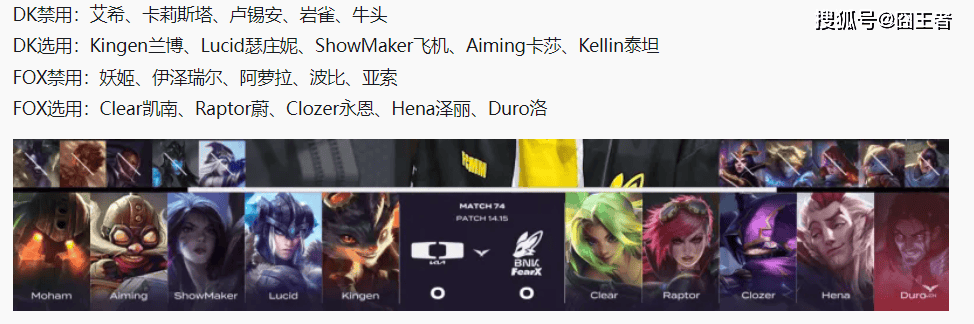 决胜局,FOX蓝色方,禁用妖姬、阿萝拉、伊泽瑞尔、烬、炸弹人,选用纳尔、盲僧、岩雀、艾希、蕾欧娜;DK红色方,禁用蔚、鳄鱼、兰博、亚索、永恩,选用船长、大树、飞机、女枪、芮尔