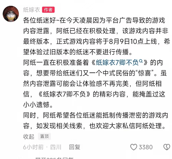?什么?偷跑了?!不是9号10点吗?现在单机游戏也流行偷跑了吗?后来姬看了一下,在抖音上,甚至已经有部分主播开始直播《纸嫁衣7》了。