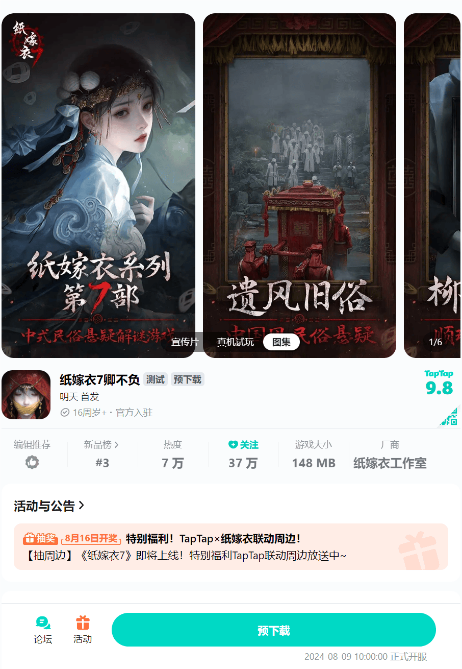 国产恐怖解谜系列游戏《纸嫁衣》的第七部不是就要出了嘛,官方也说了,8月9日10点!我们不见不散哦~