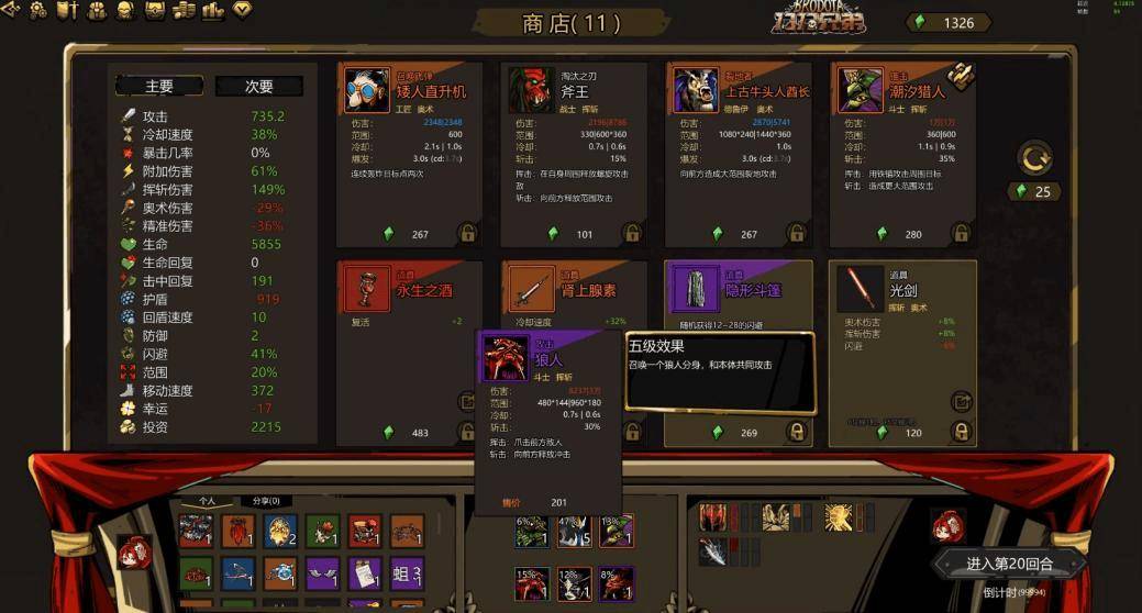整局游戏共有20关,每一关都有战斗回合与商店回合,两者相辅相成。
