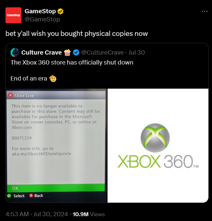值得注意的是,本次事件在社区中引发了一场关于游戏主机越来越依赖在线功能的讨论,而知名线下游戏销售商 GameStop 在 X(推特)上的言论则将相关舆论推向高峰。7 月 30 日,GameStop 转发了媒体对本次事件的报道,并附言:“打赌你们现在肯定希望购买实体游戏了”。
