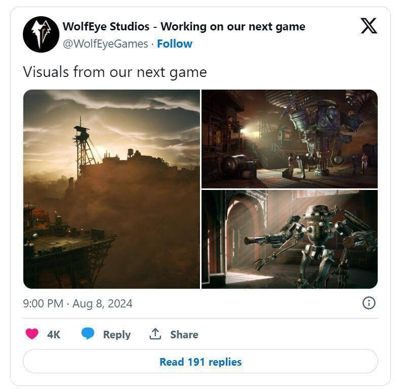 《诡野西部》开发商 WolfEye Studios 继续透露下一款游戏的更多细节,当然,工作室还没有完全公布新作的信息,包括名称以及平台等。