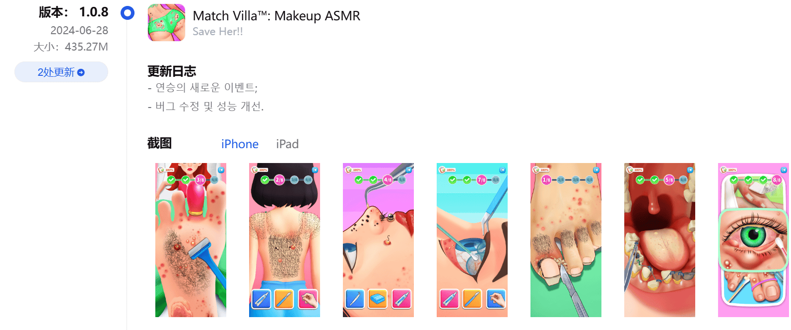 接下来的两个月内,《Match Villa》还比较保守,但在12月底的一次更新里,将商店主页的宣传图替换成了更为重口和猎奇的画面,并于今年二月前后开始在韩国地区进行较大力度的宣传。