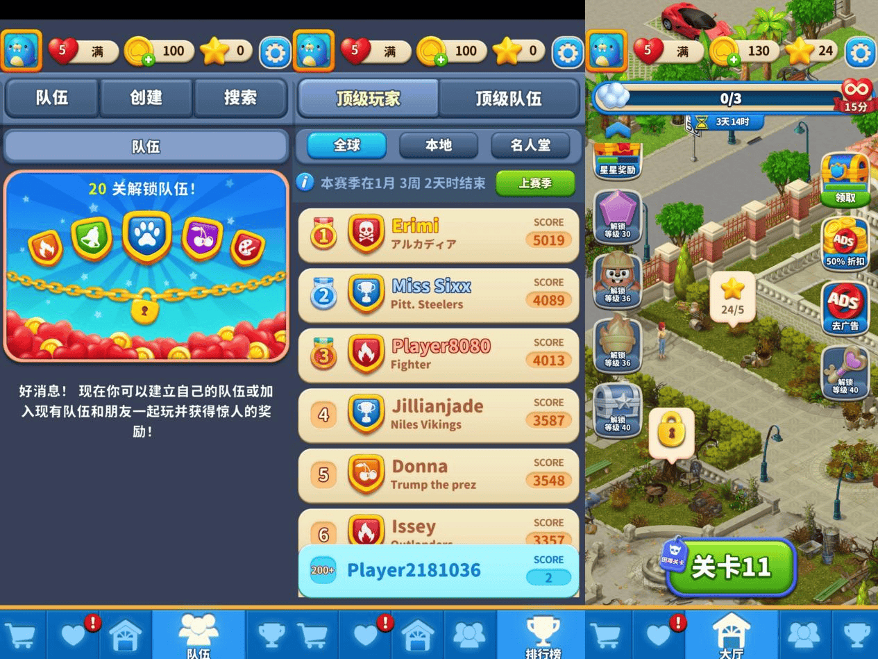 同时,在外围部分,《Match Villa》增设了阶段奖励鼓励玩家进行推关,从11级开始到30、36、40级等不同阶段,都有对应的额外奖励模式和玩法,并且还有好友组队系统以及个人/队伍排行榜,既能够增加人传人的分享推荐,同时也能激发玩家的攀比欲和挑战欲。这一点设计是个不错的拉新促活手段,值得同类厂商参考。