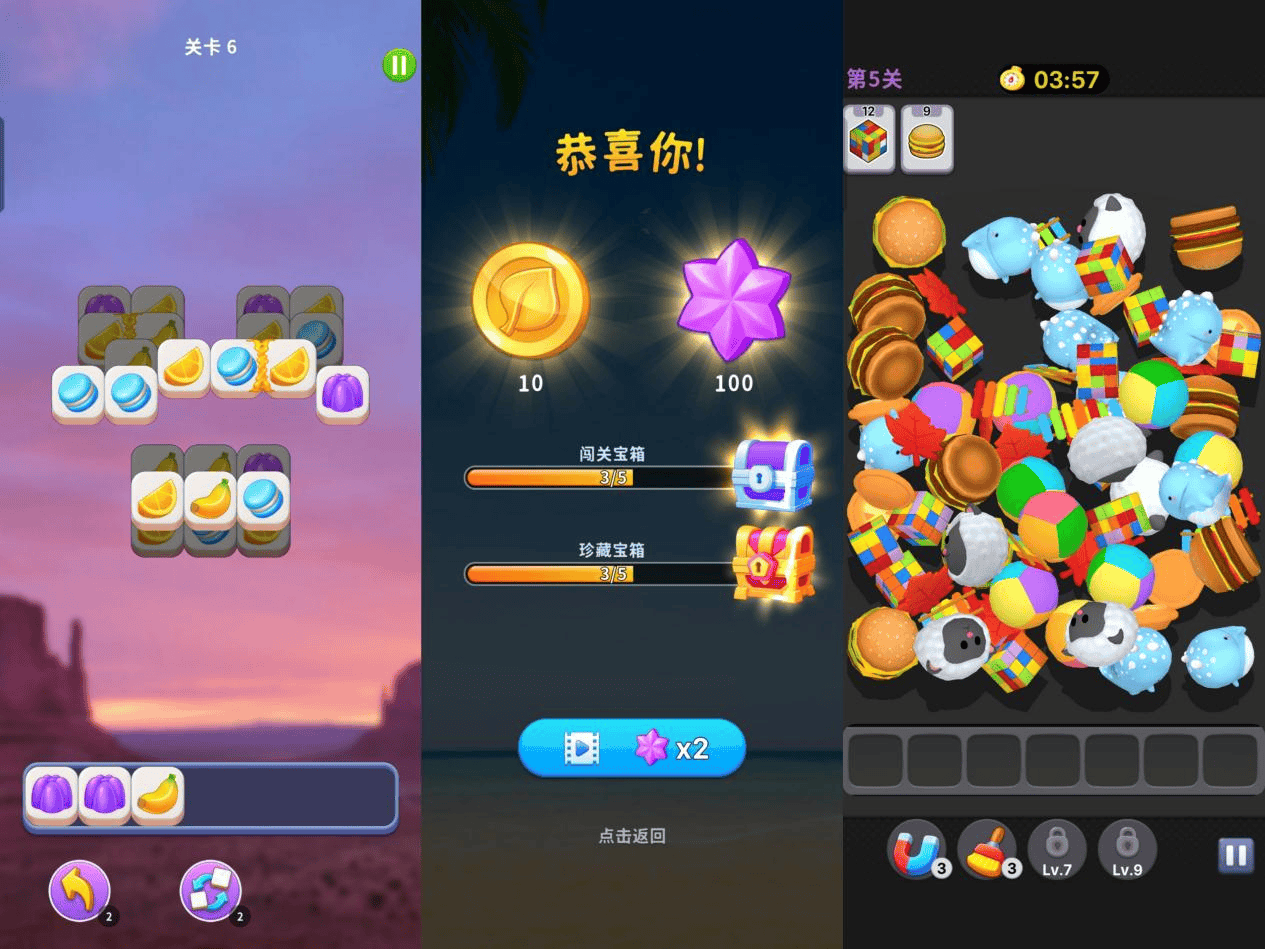 《Makeover Tile: Help Her》同样是混合变现产品,核心玩法也是消除+装修,只不过,《Makeover Tile》明显想全都要,核心玩法上是采用了类《Tile Busters:Match 3 Tiles》的配对消除,也参考了《Tile Busters》的匹配机制和谜题设计,以关卡的形式层层推进,随着等级的解锁,会出现胶水、锁链、冰块等障碍物,带给玩家更强的策略性。在外围上则加入了3D堆叠消除玩法。两种类型的消除关卡还能共同累计等级&星星奖励。