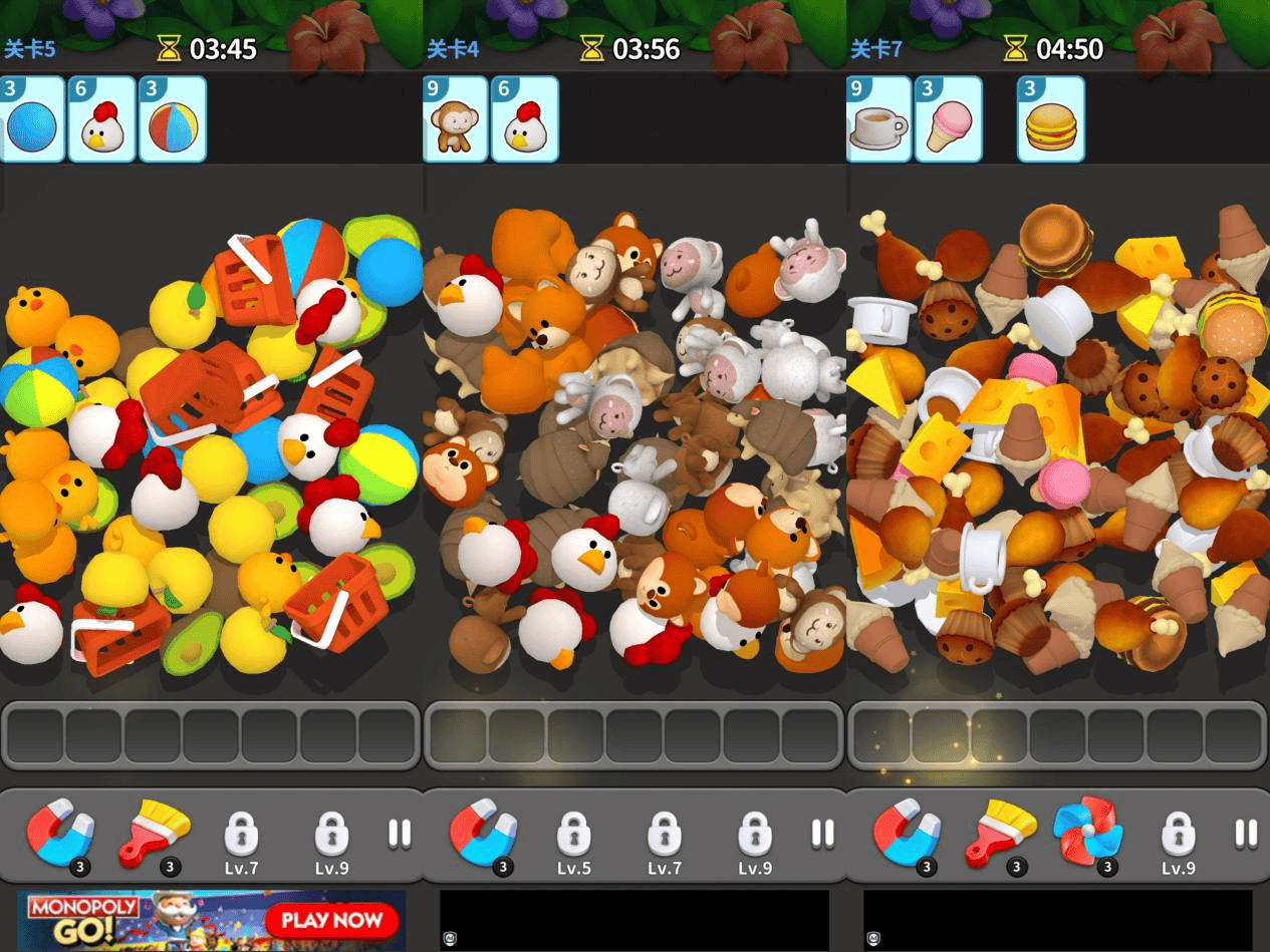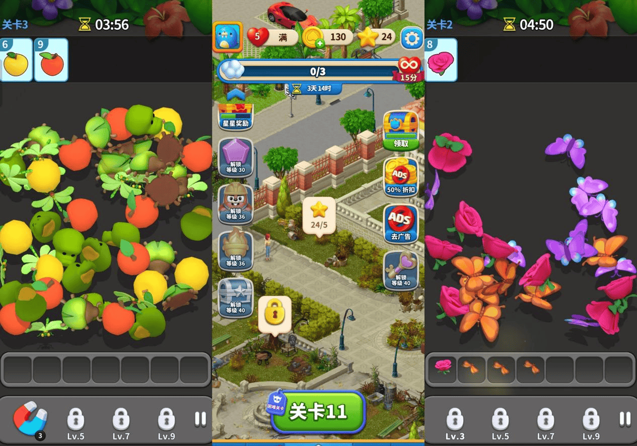 3D堆叠消除玩法,相信大家都比较熟悉了,相对而言,《Match Villa》的特别之处在于其在消除反馈方面加上了碰撞,并且在消除对象的选择上采用了与装修玩法契合的元素,比如该游戏是从装修花园入手,所以前几关消除元素中包含蜜蜂、花朵、蝴蝶等,这样细节的设计,也进一步增强了整个游戏玩法间的关联,让玩家能够在消除之余留下“需要装修”的潜在印象。