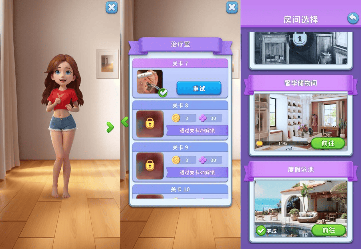 此外,《Screw Frenzy》和《Makeover Tile》一样,也采用了写实的装修风格,但在玩法逻辑上,《Screw Frenzy》与前两款产品都有所不同。相较于前两者将ASMR美妆做进关卡内——更像是要借助ASMR美妆吸引玩家,但实际在关卡内前期却没有这类玩法的体验和展示(笔者目前解锁到20关仍然没有发现),《Screw Frenzy》将拧螺丝、装修、ASMR美妆都单独做成了模块供玩家体验,只不过,玩家需要先推进主线关卡(拧螺丝),每隔5关后会解锁ASMR美妆玩法“治疗室”,并且将女主放到了主界面上为玩家展示经过治疗后逐渐恢复的样子,以此位玩家推关提供动力。同样,推关获取的家装币则用于装修,装修系统设计成了单独房间,玩家可以逐渐解锁并进行改装。
