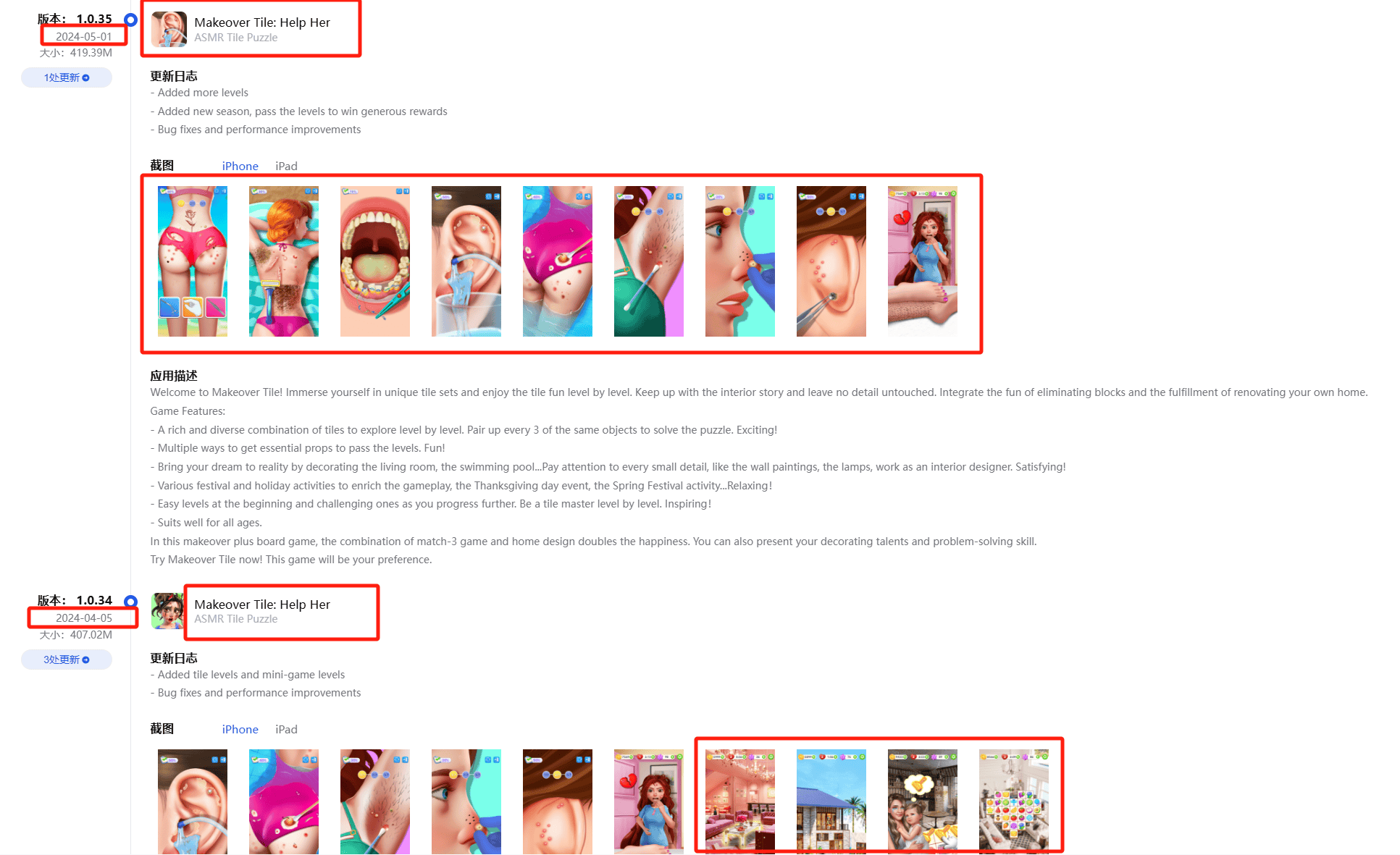 值得注意的是,今年4月初开始至今,《Makeover Tile》将游戏描述从Happ Match换成了ASMR Tile Puzzle,并且将商店主页的所有宣传图都换成了ASMR美妆,连消除玩法展示都直接去掉了,icon契合夏季和新的流行趋势交替换成泳装和清洗耳道。