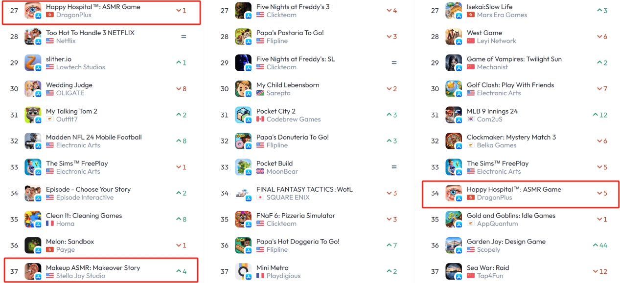 以美国为例,在美国地区TOP100(iOS和Google Play双端)的模拟类游戏榜单中,已经有8款产品榜上有名,其中天龙互娱的《Happy Hospital:ASMR Game》排名最高,位列美国免费模拟游戏榜27,畅销榜34,《Makeup ASMR》位列TOP37。