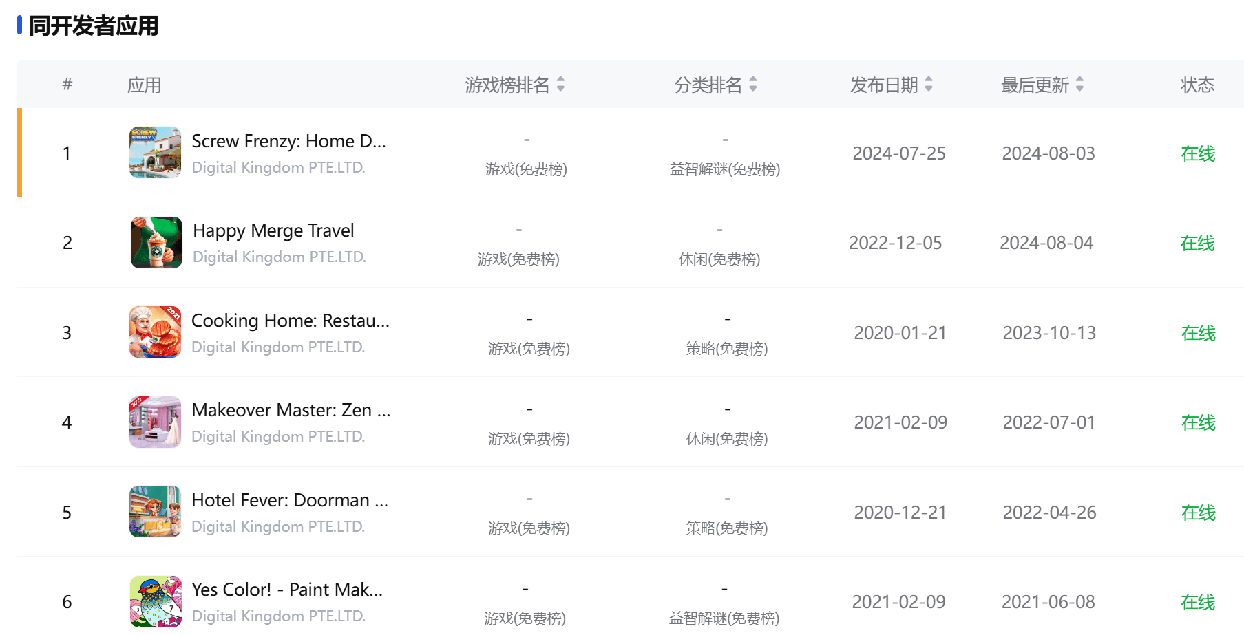 《Screw Frenzy: ASMR》今年7月25日才上线,玩法上是拧螺丝+装修+ASMR美妆,也是我们近期观察到的首个将拧螺丝玩法跟ASMR美妆相结合的产品。这款产品背后厂商Kingdom Joy Games,官网显示公司总部在新加坡,曾经发行过Merge、Cooking、Makeover、Hotel、Color等多款模拟益智类产品,对于热点的嗅觉非常敏锐。近几个月,应该是看到拧螺丝玩法突然翻红,并基于自身在模拟类产品中积累的经验和优势快速反应推出了《Screw Frenzy: ASMR》这款产品。