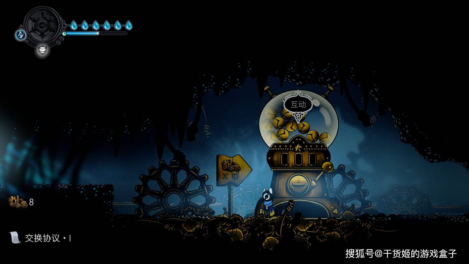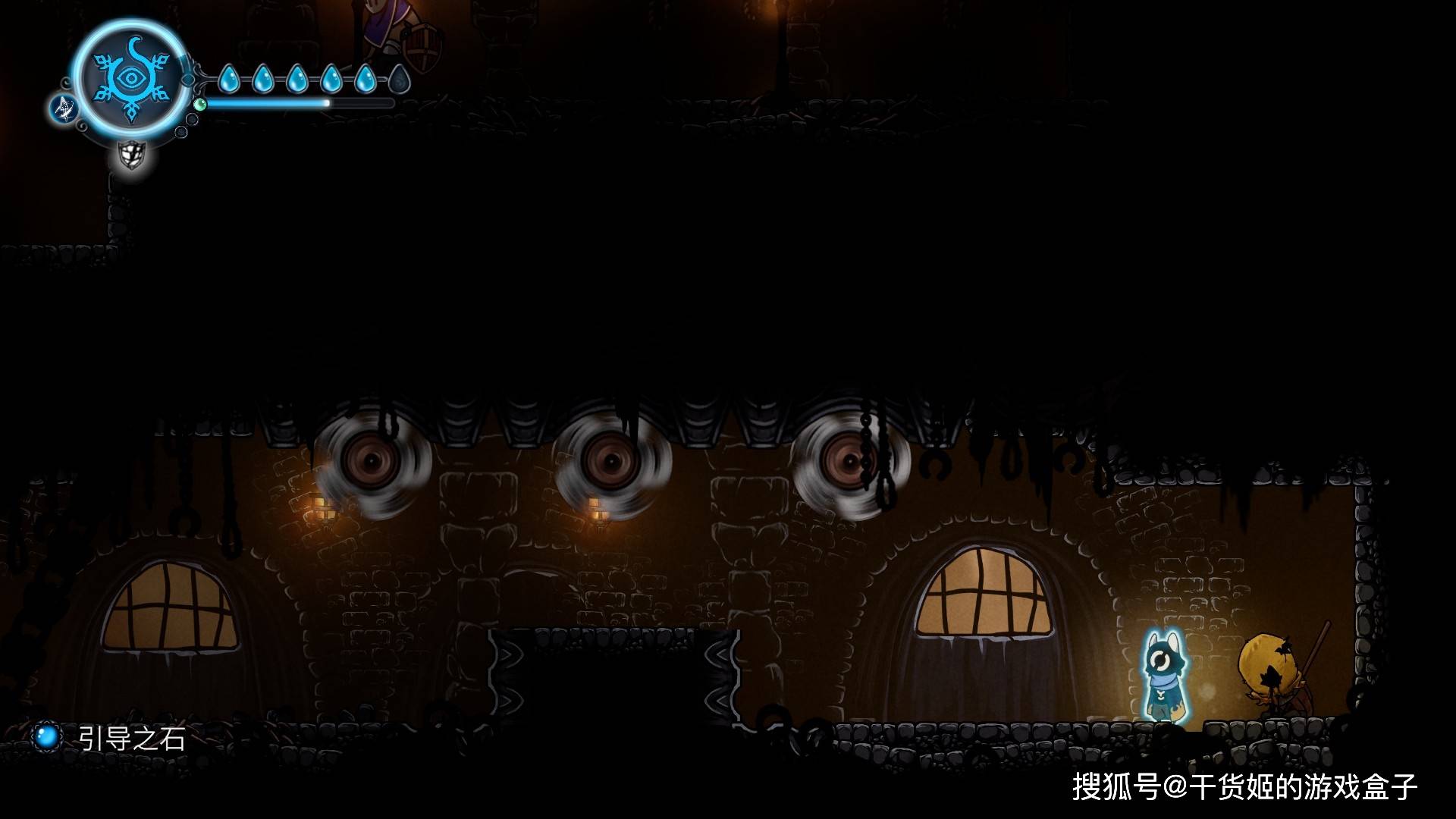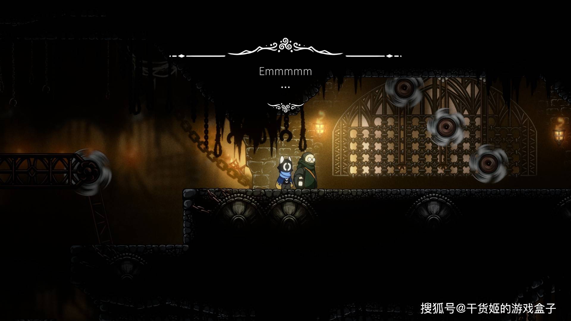 为什么有点小怪有眼珠,有的小怪没有;为什么基地外边直接是苔原,画面一下又跳地牢呢?对于这些虚构层的东西,制作组给出的答案是:放着不管!文字上,本作非常异常顶级直白,在显示认知偏差特点上十分过于给力;画面上,如果玩家仔细看背景能够发现,除了初期地图是严格按照HK式的三段式外,其他地图直接采用的模糊加配饰的做法:虽然不想吐槽,但随机浮空的齿轮实在是太不知所谓了,直接体现了制作组资源不足,当然取舍下来没啥必要,因为此时已经引入大量机关吸引玩家目光,背景跟音乐一样,模糊、不够突出,反而使玩家注意力集中在关卡本身上。