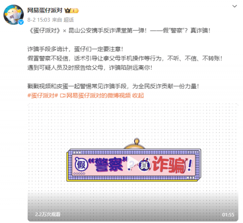在数字时代中,未成年网络安全问题日益凸显,诈骗手段层出不穷,让家长们忧心忡忡。为此,热门手游《蛋仔派对》加入到了全民普法的浪潮中,在这个暑期与昆山公安强强联手,共同聚焦于未成年群体,为他们精心编织起反诈保护网。