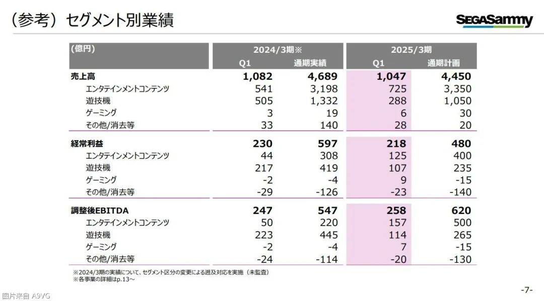世嘉飒美集团今日公开24-25财年Q1(4月~6月)财报,该季度销售额1047.55亿日元,同比减少3.2%,营业利润193.41亿日元,同比减少15.0%。