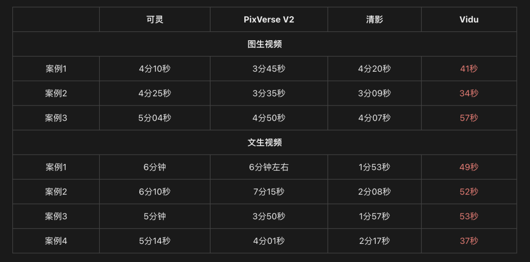令人比较意外的,新秀Vidu不论是在哪个赛道,都只需要1分钟不到的时间,是唯一一个进到“秒生成俱乐部”的玩家。