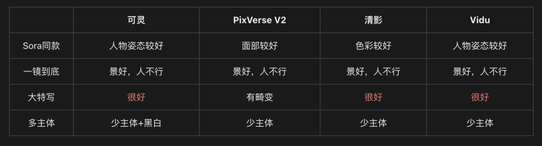例如可灵和Vidu的人物在走路姿态上更自然一些;PixVerse V2的人物在面部的一致性上较好;而清影则是整体画面的色彩更为丰富。