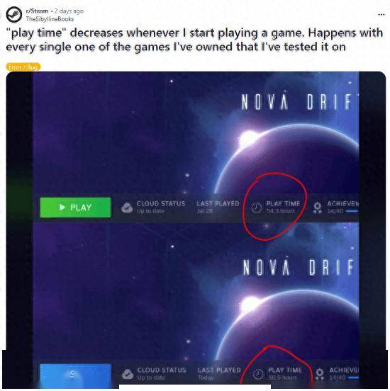 通过图片可以看到,这位玩家在玩一款叫做《新星漂移(Nova Drift)》的太空战斗游戏,上半图的游玩总时长为54.3小时,而在启动游戏后,游玩总时长变成了50.9小时。在评论区里,除了一些玩家在猜测Steam平台出现此Bug的原因之外,一位玩家还表示自己在Steam Deck离线玩游戏时也出现了这种情况。