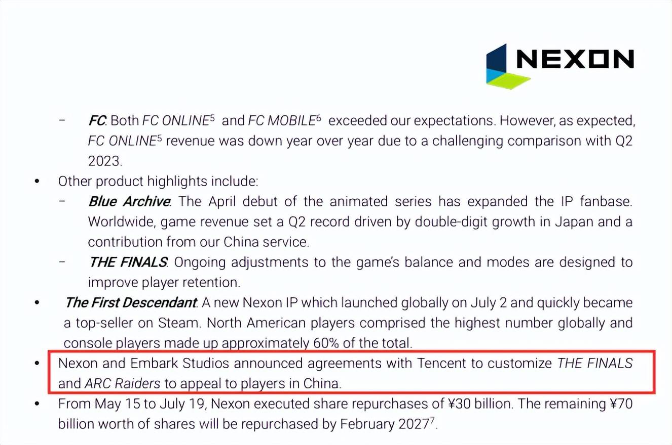 在Nexon2024年第二季度财报中表示,Nexon和Embark Studios已与腾讯达成协议,将在中国发行《THE FINALS》和《ARC Raiders》。腾讯将与 Embark Studios 和 Nexon 密切合作,根据中国玩家的口味和偏好定制这两款游戏的功能、内容和本地化。