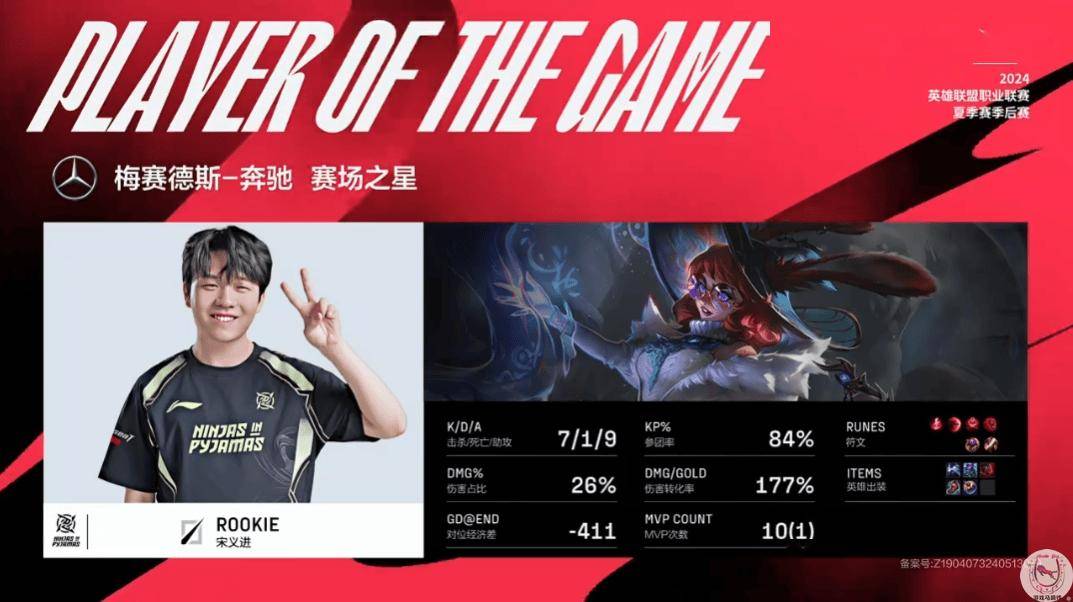 首盘基本上是NIP的碾压局,Rookie手里的新英雄游走效率高,最终拿下了7-1-9的战绩,也是顺理成章得到了MVP。