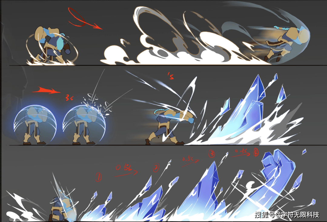 一般在项目初始,特效师会根据策划的需求进行特效的手绘设计,在前期就明确特效的基本基调和大致情况。而如何通过引擎去实现3D效果,配合节奏和光感,则需要特效师的色彩感和节奏感了。