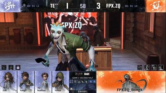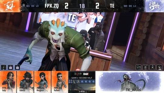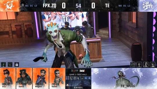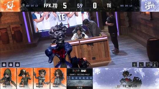 FPX.ZQ的求生者选择了律师、前锋、教授、冒险家(BAN时空之影、歌剧演员);TE的监管者WLizi选择了孽蜥。(BAN先知、空军、舞女、拉拉队员)