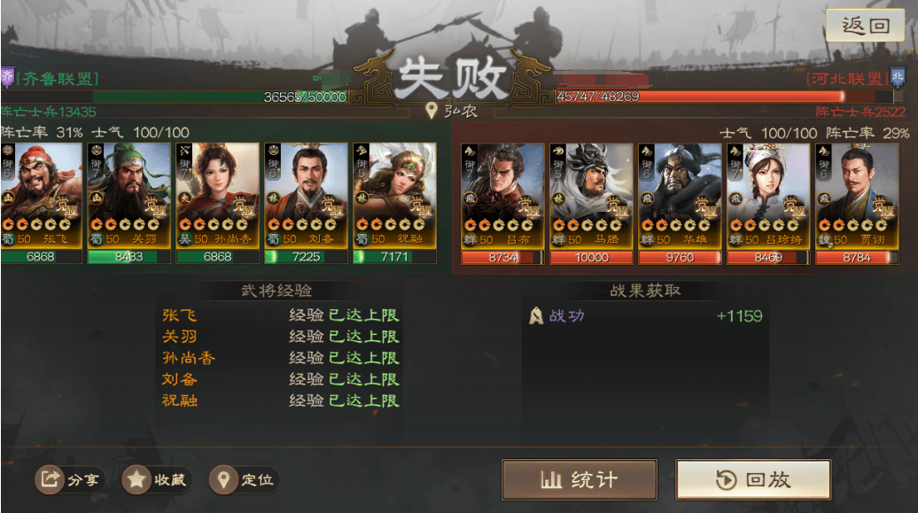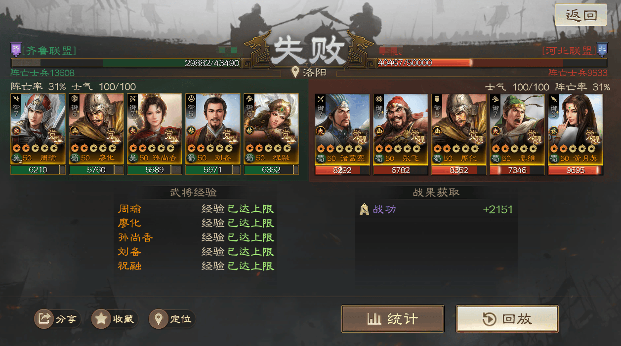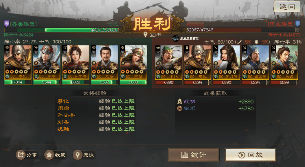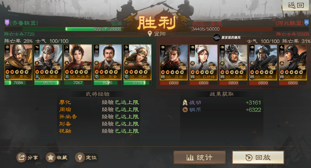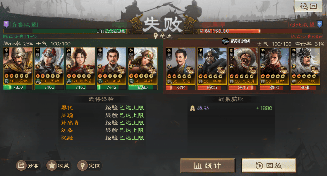输的两把战报里面,群骑对面是手操的,且这个战报没带节烈,SP周瑜直接被贾诩控死了;北伐这个战报则是低兵力,对面光环就差先礼后兵,其他都带了,配置有些豪华打不太动。