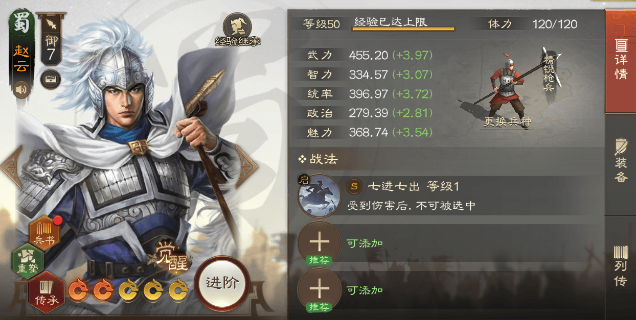 孙尚香的战法也进行了降配,因为有SP周瑜补充输出,因此孙尚香可以直接带【沥血求饴】+【虓虎之师】打AOE和断粮(不换也可以)。