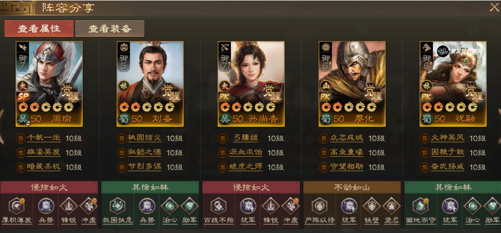 这个队伍里孙尚香和祝融的联动依然存在,另外SP周瑜其实也挺适合祝融,因为他的输出非常高。群体分摊苟住,祝融被动定向稳血线,打出像荣辱相生+华佗被动治疗的效果。