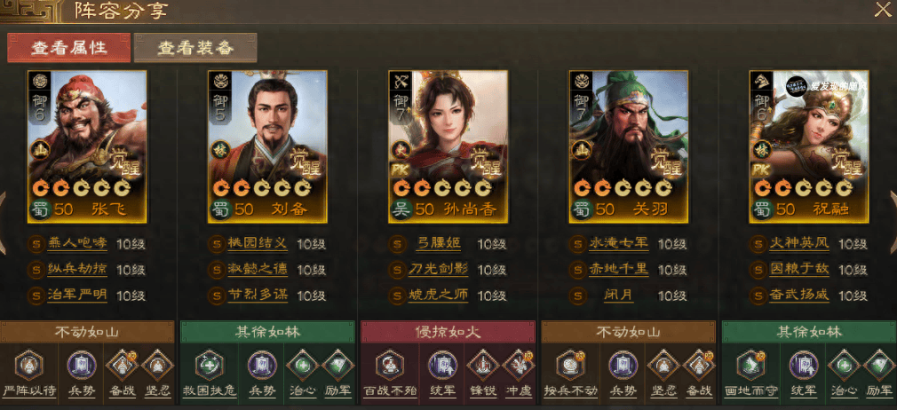 桃园祝融香香队伍,关羽转盾兵,坦度上升了不少,基本不会一下子就被秒了,这里低配带【赤地千里】+【闭月】,其中【闭月】是可以换任意减伤战法的,高配就带【高垒重壕】+【一夫当关】。