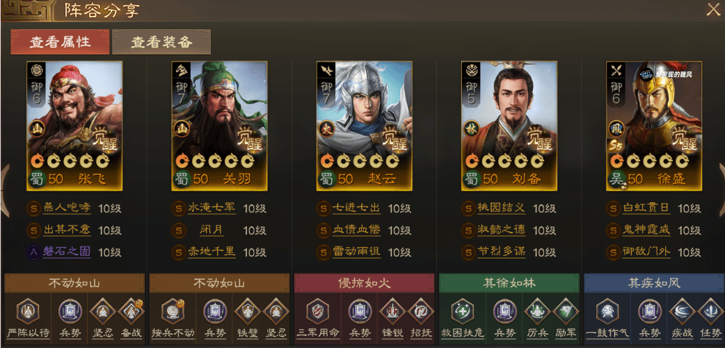 目前在正式服中暂时用的队伍,战法因为共存问题张飞给的比较低配,装备也是200分紫装+蓝绿装,胜率也在50%以上,勉强还算能用。