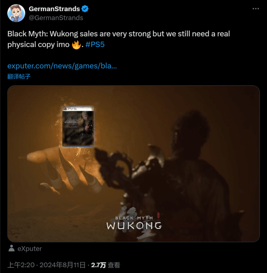 尽管数字版游戏已经畅销,但仍有大量国外玩家迫切希望《黑神话:悟空》能推出实体盘版本。推特用户GermanStrands近日表示:“这款游戏的销量确实相当惊人,但我认为我们仍然需要真正的实体版本。”