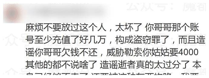 她甚至还企图勒索逝者母亲,据说要4000元才肯把账号还回来,逝者母亲查看了逝者当年给她花的钱,非常多,这个女人可以说是极端的没有良心了。