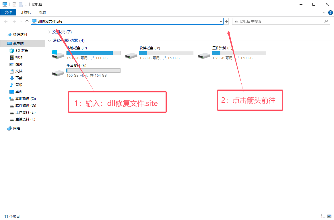2.进入此电脑以后,在顶部文件路径输入:dll修复文件.site(鼠标移到右侧的箭头点击)打开系统dll文件检查工具。