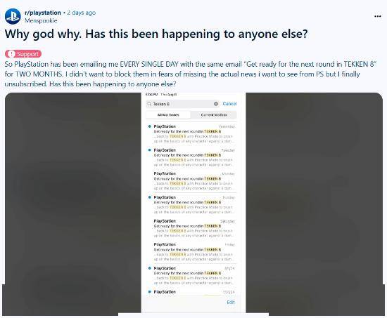 最近,一名玩家在社交媒体上分享了他的经历。他发现索尼PlayStation每天都会向他发送一封相同的《铁拳8》宣传邮件,邮件标题为“准备好参加《铁拳8》的下一轮比赛”。他对此感到困惑,因为他并不想取消订阅这些邮件,因为担心错过PS相关的实际新闻。尽管如此,最终他还是选择取消了这些邮件。