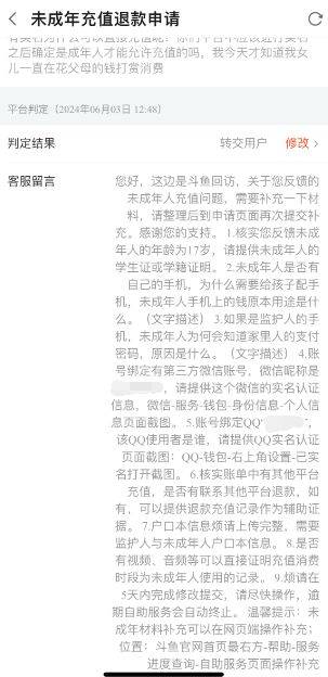 值得一提的是,斗鱼客服要求她提交的补充材料或要求高达9项之多,例如第8项为是否有视频、音频等可以直接证明充值消费时段为未成年人使用的记录。