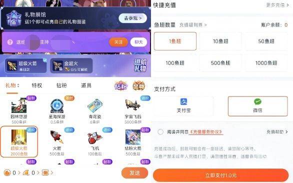 充值之后,消费者可以得到人民币等值的鱼翅(安卓手机充值),可以在斗鱼App给主播赠送相应的“火箭”“超级火箭”“飞机”等礼物,例如“火箭”要500鱼翅,而“超级火箭”要2000鱼翅,即2000元。除了各式礼物,消费者还可以消费“特权”“钻粉”“道具”等。