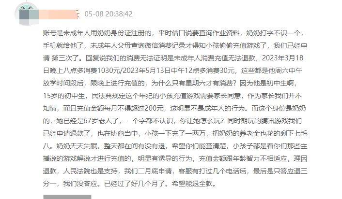 投诉平台上还有未成年人用67岁奶奶的身份证进行注册并充值的投诉。投诉者认为,老人已经67岁,字都不认识,充值金额跟年龄智力不相适应,理应退款。