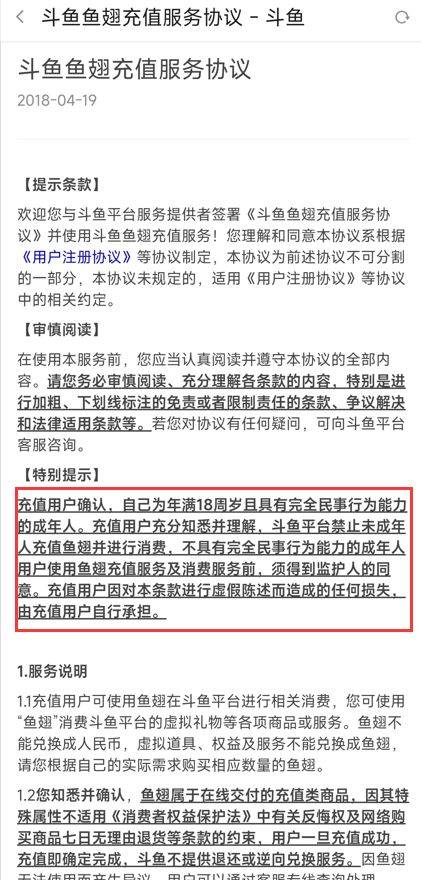 《消费者报道》记者发现,在充值时,斗鱼App确实会有“斗鱼严禁未成年人充值打赏”的提醒,且有一份“斗鱼鱼翅充值服务协议”需要勾选。该协议写明“充值用户充分知悉并理解,斗鱼平台禁止未成年人充值鱼翅并进行消费,不具有完全民事行为能力的成年人用户使用鱼翅充值服务及消费服务前,须得到监护人的同意。充值用户因对本条款进行虚假陈述而造成的任何损失,由充值用户自行承担。”