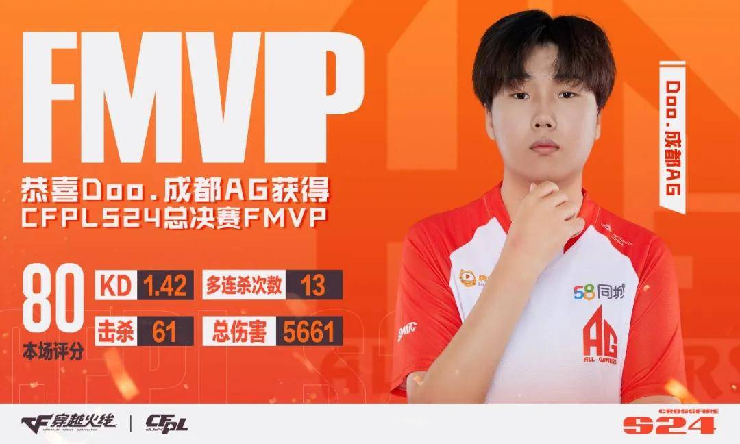 决胜局成都AG.Doo再度爆发帮助队伍最终取胜,帮助队伍以3:1的总比分击败宿敌白鲨,让成都AG重回巅峰。依靠着稳中带爆的发挥,成都AG.Doo拿到属于他的第一个FMVP殊荣,期待未来这位“小巨人”能够继续给CFer带来更多精彩的发挥!